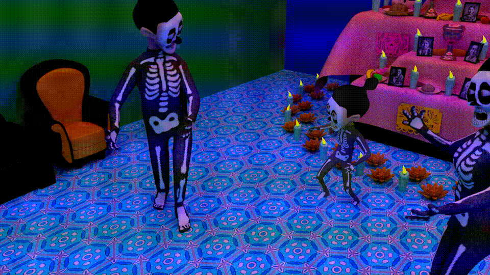 Short film, 3D-animated. In a magical old Mexican village, a beautiful family celebrates the Day of the Dead. As they dance to Cumba music, they suddenly transform into skeletons, symbolizing an even stronger tie to those who have passed away and live on in their memories. They continue dancing – as magical, colorful Alebrije creatures appear to celebrate with them. Participating artists: Lorenz Foth, Hugo Rivas, Estefanía Carrera, Teresa Gallo, Jaqueline Hernandez and Ana Cristina Quiñones.